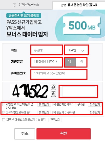 이름과 주민등록번호 입력 후 확인을 눌러줍니다.
